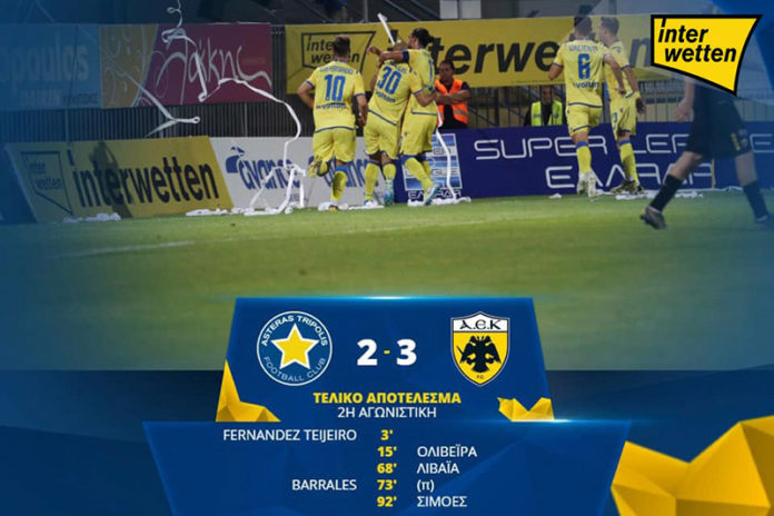 Η ομάδα του Αστέρα που μέχρι το 71’ δεν κατάφερε να κάνει τίποτα απολύτως στον αγωνιστικό χώρο, ευτύχησε σε αντικανονικό σπρώξιμο του Μπακάκη στον Μπαράλες να κερδίσει πέναλτι. Ο Αργεντίνος επιθετικός του Αστέρα εκτέλεσε εύστοχα την επίθεση και κατάφερε να σκοράρει για το 2-2. Η συνέχεια στο ματς γνωστή με τους παίκτες της ΑΕΚ να συνεχίζουν την πίεση προκειμένου να έρθει ένα τρίτο γκολ. Παρά την κόπωση που είχε αρχίσει να κάνει αισθητή την παρουσία της στα πόδια των παικτών του κ. Κωστένογλου, η προσπάθεια για τη νίκη συνεχίστηκε, με τον Αστέρα απλά να προσπαθεί να αμυνθεί. Στις καθυστερήσεις μετά από σέντρα του Παουλίνιο από δεξιά, ο Σιμόες με σκαστή κεφαλιά έστειλε τη μπάλα στην εστία των «Αρκάδων» για το 2-3 και την επικράτηση σε ένα συναρπαστικό σε εξέλιξη ματς.